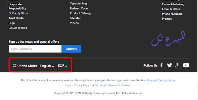 أولا تقوم بالذهاب الي موقع godaddy وتقوم بالنزول الي أسفل في نهاية الموقع وتقوم بتغير اللغة الي اللغة الأنجليزية الولايات المتحدة الأمريكية وتقوم بتغير العملة الي الجنية المصري.