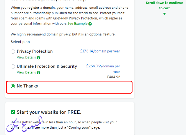 بعدها سيطلب منك اذا كنت تريد اضافة مميزات اخري للدومين ولكن سوف تزيد من السعر الخاص بة ، قم بأختيار خيار No Thanks وتابع للخطوة التالية.