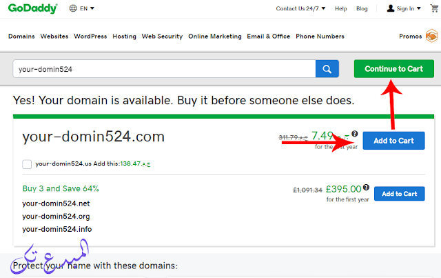 بعدها سوف يظهر لك جميع الدومينات المتاحه ويظهر لك الدومين الذي كتبتة بعدة .com ويظهر لكم السعر أمامة كما ترون في السعر حاليا موجود 7.49 جنية مصري ، هنا الموقع قام بأضافة كوبون تلقائيا اذا لم تجد السعر بهذا الشكل تابع الخطوات الي أن نصل الي منطقة اضافة كوبون خصم وسنقوم بأضافة الكوبون الخاص بتخفيض السعر ، قم باضغط علي add to card للدومين الذي اخترتة ثم قم بالضغط علي Continue to Cart لمتابعة عملية الشراء.