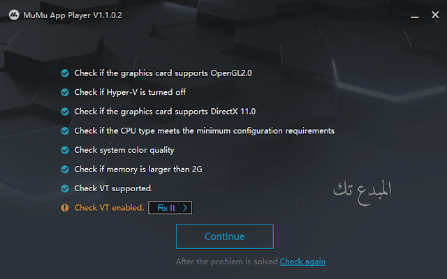 بعد تحميل ملف تثبيت المحاكي تقوم بتشغيله ، وبعدها سوف يبدأ في قراءة مواصفات جهازك ويظهر لك الامكانيات المتوافقة والأشياء التي يجب عليك تفعيلها ليعمل معك المحاكي بسلاسة أفضل وكما ترون في الصورة يطلب الحد الادنى 2 جيجا بايت رامات فقط .