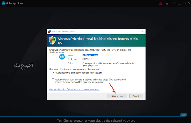 بعدها ستظهر لك نافذة بهذا الشكل قم بالسماح لجدار الحماية بان يعطي الصلاحيات للبرنامج.