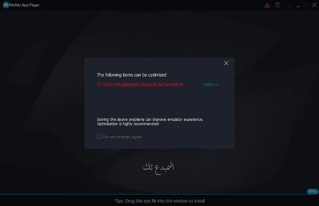 وكما ترون هذا تحذير بسبب ان خيار الانظمة الوهمية غير مفعل ، ليست مشكلة فاذا قمت بتفعيلة سيزيد من اداء المحاكي ولكن يمكنك اغلاق الرسالة ومتابعة فتح واستخدام المحاكي.